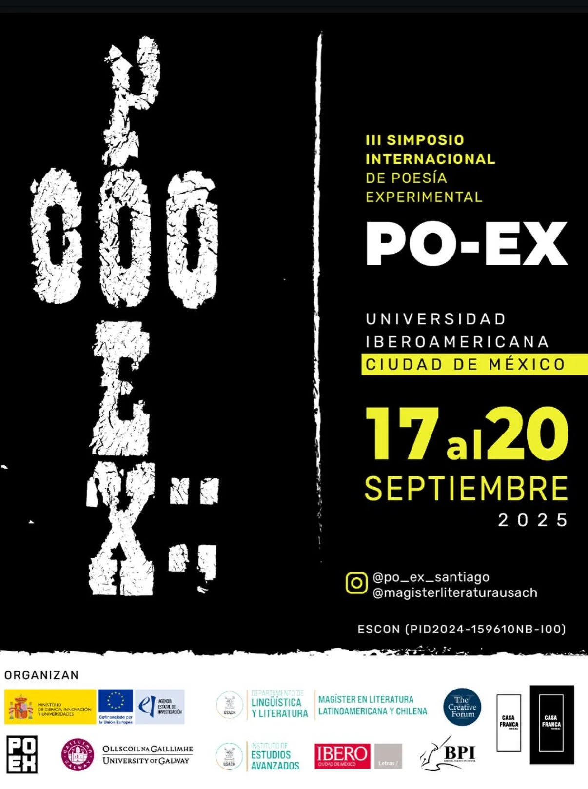 I’m thrilled to be part of the 3rd International Symposium of Experimental Poetry, or Po-Ex Symposium, taking place at the Universidad Iberoamericana Ciudad de México this week from 17-20 September, 2025 and involving an incredible number of cherished poets, performers, and thinkers across languages. Follow along at @po_ex_santiago, @magisterliteraturausach, and @ibero_cdmx!